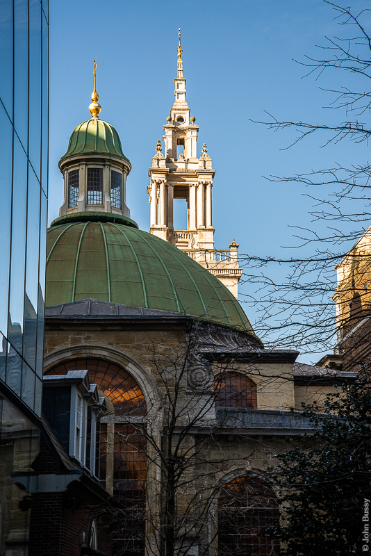 Christopher Wren’s church, close to London Bridge in the City of London, is closed in by surrounding office blocks. (Feb22)