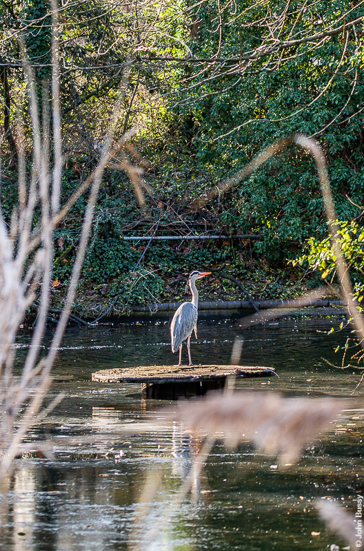 Heron on an island on the icy lake in Southwark Park. (Jan23)